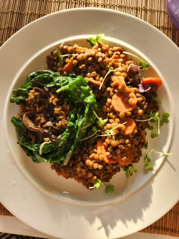 Place half of the mushroom farro on the far left side of a plate. Surround the farro by half of the swiss chard leaves. Follow the curve of the swiss chard leaf with the stewed lentils.